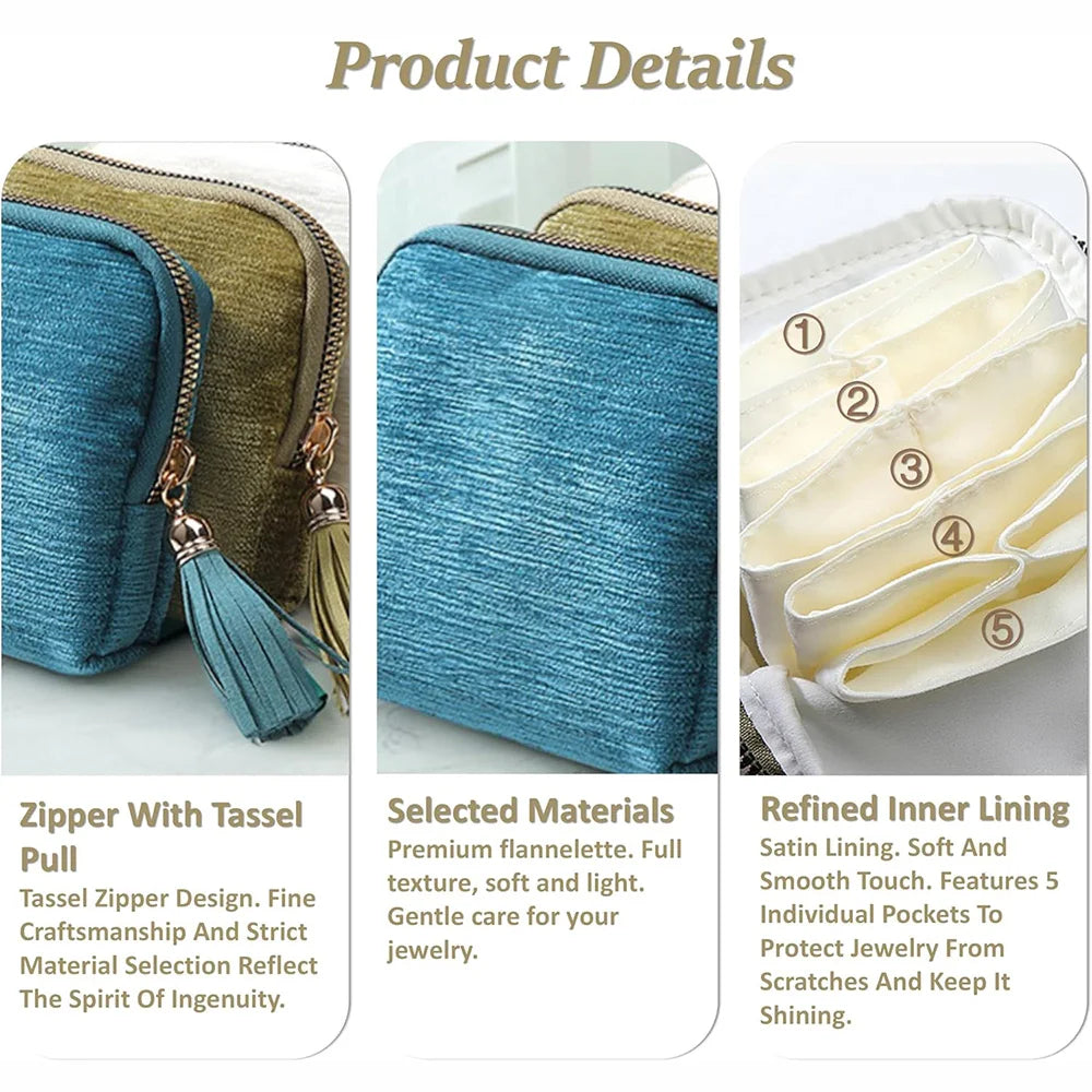 3.Durable and Practical: Easy to open and close with a elegant secure tassel zipper system, while the chic tassel adds a touch of sophistication to your travel accessories jewelry case. Soft velvet interior lining ensures your jewelry, crystals, and watches are shielded from scratches